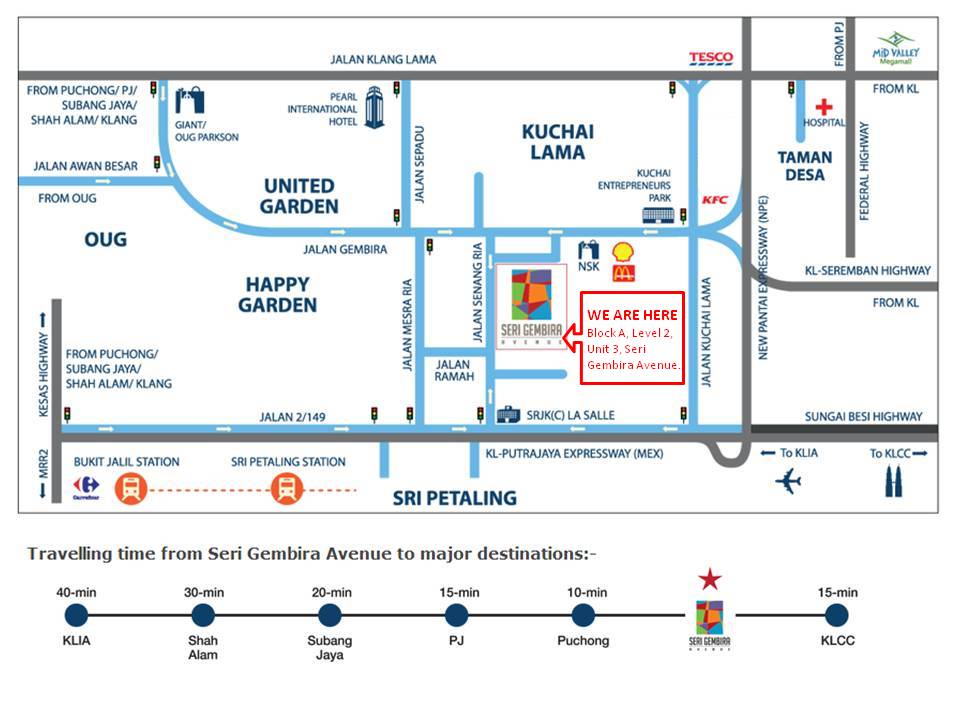 Location of the KUALA LUMPUR OFFICE: Block D, Level 01, Unit 3A of Seri Gembira Avenue. Our full address is D-01-3A, Seri Gembira Avenue, No. 6, Jalan Senang Ria, Taman Gembira, 58200 Kuala Lumpur.